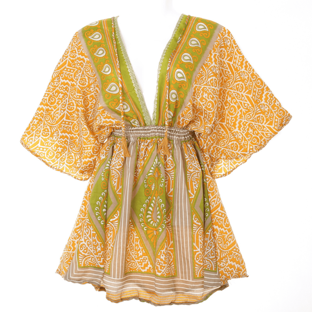Tento konkrétní kus byl vytvořen formou upcyklingu ze slavnostního sárí a byl již rozbalen a využit pro focení a videopropagační účely. Vyberte si šaty střih Cassiopeia a získáte nejen stylový kousek oblečení, ale i jedinečný kus s příběhem.