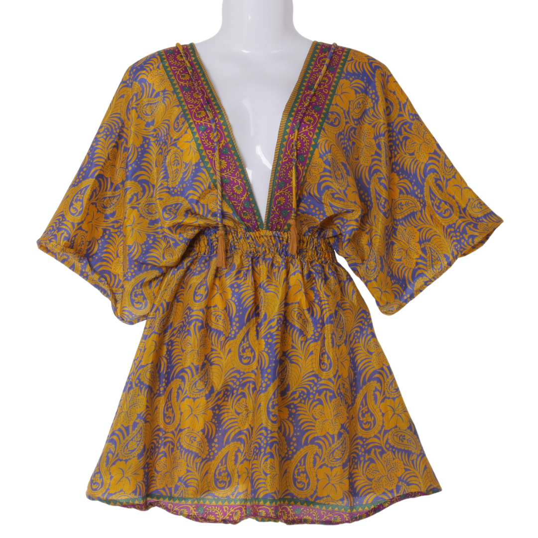 Tento konkrétní kus byl vytvořen formou upcyklingu ze slavnostního sárí a byl již rozbalen a využit pro focení a videopropagační účely. Vyberte si šaty střih Cassiopeia a získáte nejen stylový kousek oblečení, ale i jedinečný kus s příběhem.