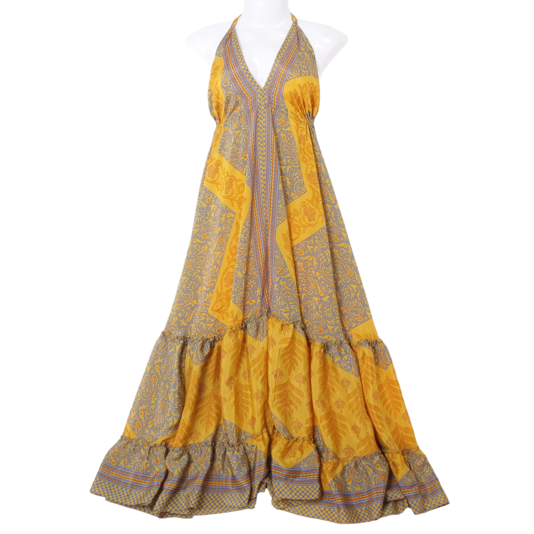 Každý kus je originál vytvořený formou upcyklace ze slavnostního sárí, a proto má každý model svůj jedinečný příběh i barevnost. Dostupné v univerzální velikosti 34–44 a ideální pro výšku postavy od cca 160 cm bez podpatků.