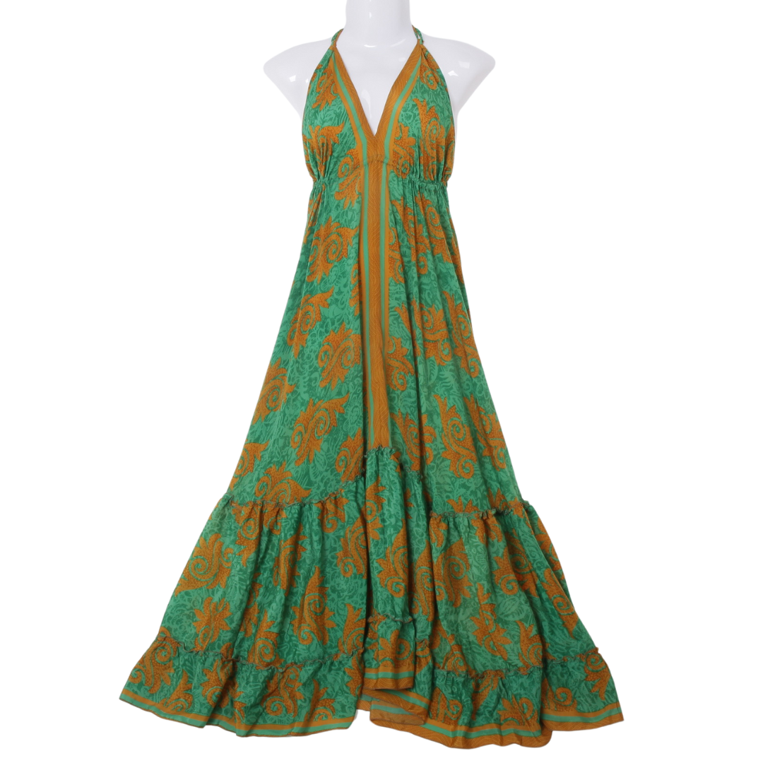 Každý kus je originál vytvořený formou upcyklace ze slavnostního sárí, a proto má každý model svůj jedinečný příběh i barevnost. Dostupné v univerzální velikosti 34–44 a ideální pro výšku postavy od cca 160 cm bez podpatků.