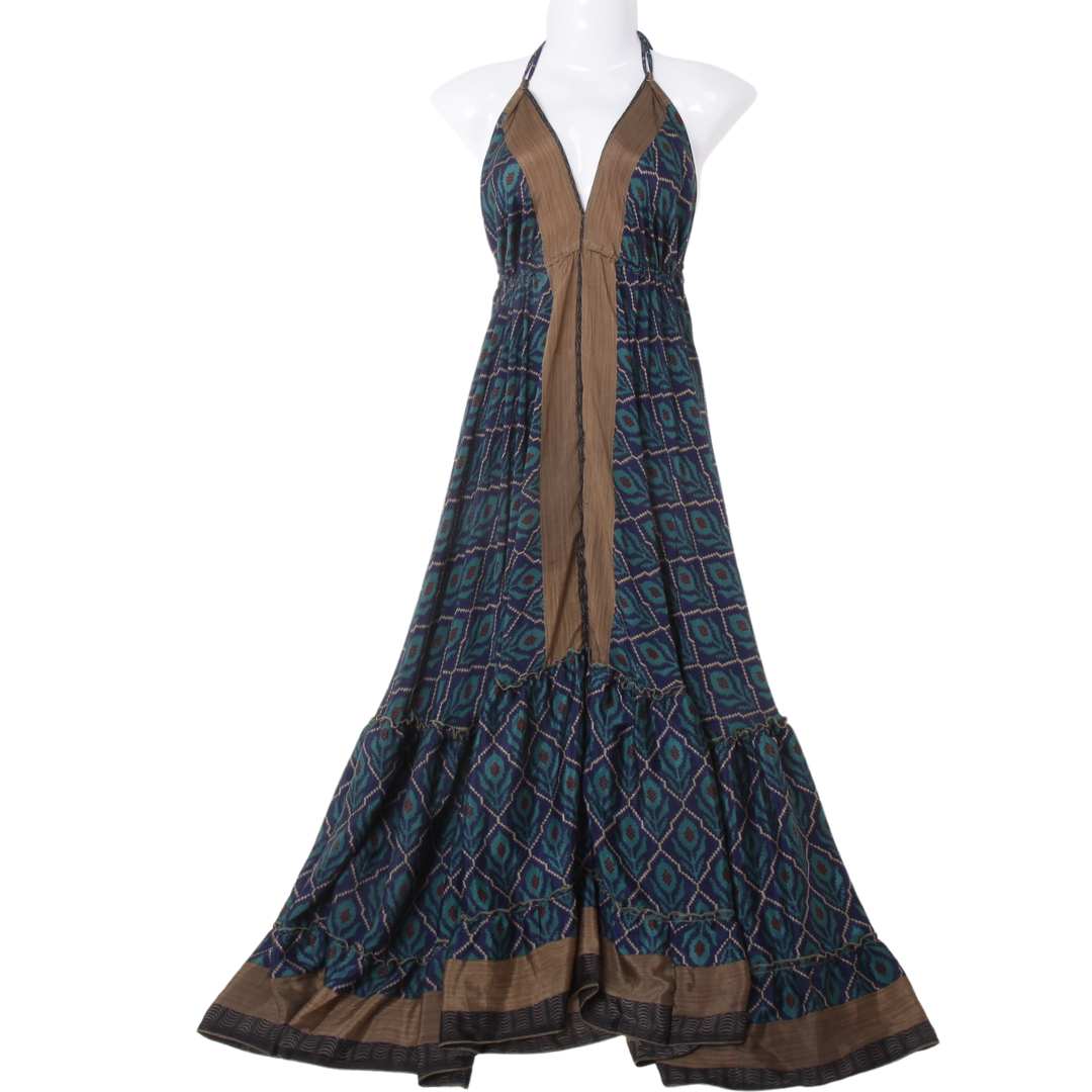 Každý kus je originál vytvořený formou upcyklace ze slavnostního sárí, a proto má každý model svůj jedinečný příběh i barevnost. Dostupné v univerzální velikosti 34–44 a ideální pro výšku postavy od cca 160 cm bez podpatků.