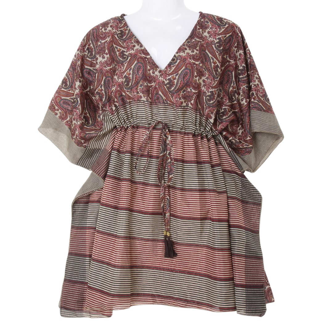 Tato tunika vznikla formou upcyclingu z použitého slavnostního sárí. Byla rozbalena a použita pro focení a videopropagační účely, a nyní čeká na svou novou majitelku, která ocení jak její krásu, tak i ekologickou hodnotu.